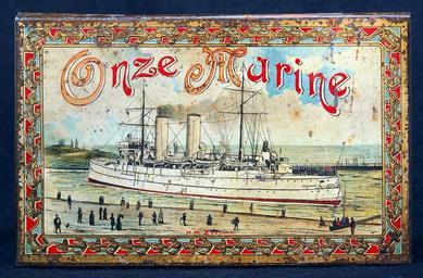 | Keywords: Onze Marine cigarenblik, foto 7.JPG Very old packaging of a Dutch product that is not produced and/or not sold any more Photographed at a collector of Droste memorabilia and old tin cans Rechthoekig scharnierend deksel Op alle zijden een schip zowel stoomschepen als zeilschepen in goud rood en blauw Elke voorstelling omrand met attributen uit de marine ankers stuurwiel reddingboei sabels vaandel Deksel 'Onze Marine/H M Zeeland Zijkant voor 'H M Koningin Wilhelmina der Nederlanden' Zijkant achter 'H M Pantserschip Piet Hein' Zijkant rechts 'H M Fregat Joh Wil Friso For more info see http //www tincollectors nl/ tincollectors nl or email info tincollectors nl own 2014-04-11 12 18 01 Alf van Beem CC-Zero Trademarked Cigar tins Onze Marine cigars |