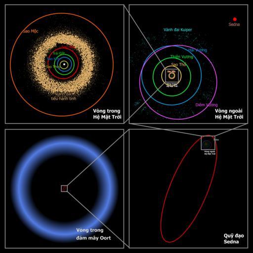 | Keywords: Oort cloud Sedna orbit-vi.svg trans-Neptunian object 90377 Sedna which lies in the farthest reaches of the Solar system <ref>http //www spitzer caltech edu/Media/releases/ssc2004-05/release shtml Most Distant Object in Solar System Discovered Press release Jet Propulsion Laboratory March 15 2004 </ref> Each panel moving clockwise from the upper left successively zooms out to place Sedna in context The first panel shows the orbits of the inner planets and Jupiter; and the asteroid belt In the second panel Sedna is shown well outside the orbits of Neptune and the Kuiper belt objects Sedna's full orbit is illustrated in the third panel along with the object's location in 2004 nearing its closest approach to the Sun The final panel zooms out much farther showing that even this large elliptical orbit falls inside what was previously thought to be the inner edge of the spherical Oort cloud a distribution of cold icy bodies lying at the limits of the Sun's gravitational pull Sedna's presence suggests that the previously speculated inner disk on the ecliptic does exist <references /> Oort cloud Sedna orbit svg 2011-03-21 09 00 UTC Oort_cloud_Sedna_orbit svg Image courtesy of NASA / JPL-Caltech / R Hurt Original text courtesy of NASA / JPL-Caltech SVG conversion by Holek derivative work 20px Newone Other fields D 36 + RetouchedPicture Việt hóa Newone Oort cloud Sedna orbit svg Oort cloud Sedna Solar System Chart |