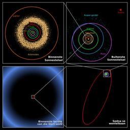 | Keywords: Oort-wolk Sedna wentelbaan.svg These four panels show the location of trans-Neptunian object 90377 Sedna which lies in the farthest reaches of the Solar system Each panel moving clockwise from the upper left successively zooms out to place Sedna in context The first panel shows the orbits of the inner planets and Jupiter; and the asteroid belt In the second panel Sedna is shown well outside the orbits of Neptune and the Kuiper belt objects Sedna's full orbit is illustrated in the third panel along with the object's location in 2004 nearing its closest approach to the Sun The final panel zooms out much farther showing that even this large elliptical orbit falls inside what was previously thought to be the inner edge of the spherical Oort cloud a distribution of cold icy bodies lying at the limits of the Sun's gravitational pull Sedna's presence suggests that the previously speculated inner disk on the ecliptic does exist Oort_cloud_Sedna_orbit svg 2009-03-29 13 42 UTC Oort_cloud_Sedna_orbit svg Image courtesy of NASA / JPL-Caltech / R Hurt Original text courtesy of NASA / JPL-Caltech SVG conversion by Holek Translation by Anrie derivative work Anrie <span class signature-talk >talk</span> Translation Anrie Oort_cloud_Sedna_orbit svg The original image PD-USGov-NASA SVG version Oort cloud Sedna |