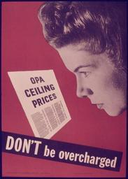| Keywords: OPA CEILING PRICES - DON'T BE OVERCHARGED - NARA - 515131.jpg Scope and content General notes 515131 Local identifier 44-PA-1467 Office for Emergency Management Office of War Information Domestic Operations Branch Bureau of Special Services 03/09/1943 - 09/15/1945 Still Picture Records Section Special Media Archives Services Division NWCS-S National Archives at College Park 8601 Adelphi Road College Park MD 20740-6001 1941 - 1945 Record group Record Group 44 Records of the Office of Government Reports 1932 - 1947 Record group ARC 373 World War II Posters compiled 1942 - 1945 Series ARC 513498 File unit File unit ARC Variant control numbers NAIL Control Number NWDNS-44-PA-1467 Other versions <gallery> File OPA_CEILING_PRICES_-_DON'T_BE_OVERCHARGED_-_NARA_-_515131 tif tif File OPA_CEILING_PRICES_-_DON'T_BE_OVERCHARGED_-_NARA_-_515131 jpg jpg </gallery> NARA-cooperation PD-USGov World War II posters from the United States |