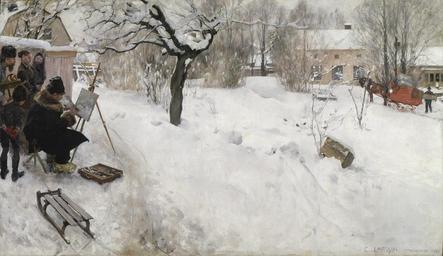 | Keywords: Open-Air Painter. Winter-Motif from Ã…sögatan 145, Stockholm (Carl Larsson) - Nationalmuseum - 19607.tif Artwork Creator Carl Larsson Open-Air Painter Winter-Motif from Ã…sögatan 145 Stockholm Carl Larsson ™s monumental painting Open-Air Painter has been seen as a manifesto for Nordic outdoor realism which came into style in the 1880s In addition to being a comment on the new practice of painting outdoors it illustrates the repercussions this had on Scandinavian artists who were now expected to work directly before their subject even in the cold winter This specifically Nordic dimension of portraying the seasons attracted great attention when the painting was shown in Paris in 1886 Carl Larssons stora mÃ¥lning FriluftsmÃ¥laren har betraktats som en programförklaring för den nordiska friluftsrealism som slog igenom pÃ¥ 1880-talet Förutom att framhÃ¥lla den nya praktiken att mÃ¥la ute i det fria illustrerar mÃ¥lningen de följder som detta medförde för de skandinaviska konstnärerna OcksÃ¥ i det svenska vinterklimatet förväntades de nu arbeta direkt inför motiven Denna specifikt nordiska dimension i skildrandet av Ã¥rstidsväxlingarna väckte uppmärksamhet när mÃ¥lningen visades i Paris 1886 header Carl Larsson ™s monumental painting Open-Air Painter has been seen as a manifesto for Nordic outdoor realism which came into style in the 1880s In addition to being a comment on the new practice of painting outdoors it illustrates the repercussions this had on Scandinavian artists who were now expected to work directly before their subject even in the cold winter This specifically Nordic dimension of portraying the seasons attracted great attention when the painting was shown in Paris in 1886 Carl Larssons stora mÃ¥lning FriluftsmÃ¥laren har betraktats som en programförklaring för den nordiska friluftsrealism som slog igenom pÃ¥ 1880-talet Förutom att framhÃ¥lla den nya praktiken att mÃ¥la ute i det fria illustrerar mÃ¥lningen de följder som detta medförde för de skandinaviska konstnärerna OcksÃ¥ i det svenska vinterklimatet förväntades de nu arbeta direkt inför motiven Denna specifikt nordiska dimension i skildrandet av Ã¥rstidsväxlingarna väckte uppmärksamhet när mÃ¥lningen visades i Paris 1886 1886 Oil on canvas Olja pÃ¥ duk Size cm 209 119 Framed Size cm 250 163 16 Institution Nationalmuseum Stockholm Signerad C LARSSON STOCKHOLM 1886 accession number 19607 NM 2546 place of creation Q1754 Nationalmuseum Nationalmuseum Stockholm cooperation project Licensed-PD-Art PD-old-auto PD-Nationalmuseum_Stockholm 1919 Media contributed by Nationalmuseum Stockholm 2016-10 Paintings in the Nationalmuseum Stockholm Paintings by Carl Larsson |