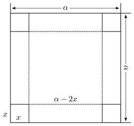 | Keywords: Open-top box.svg Elements of the Differential and Integral Calculus quote It is desired to make an open-top box of greatest possible volume from a square piece of tin whose side is a by cutting equal squares out of the corners and then folding up the tin to form the sides What should be the length of a side of the squares cut out 2012-04-28 own Eviatar Bach Created with Inkscape cc-zero Uploaded with UploadWizard Optimization Granville Elements of Calculus Files by User InverseHypercube |