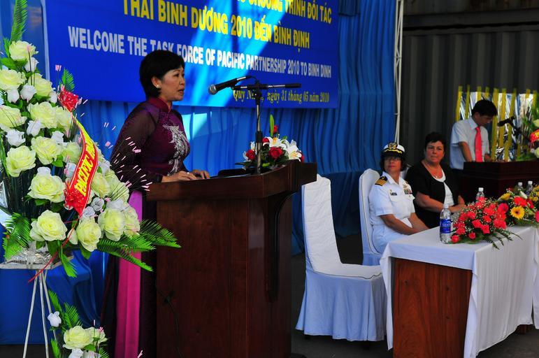 | Keywords: Opening ceremony of Pacific Partnership 2010 DVIDS285063.jpg en Dr Nguyen Thi Thanh Binh vice chairwoman of the Provincial People's Committee and Mission co-commander speaks during the opening ceremony of Pacific Partnership 2010 held at the Port of Quy Nhon Fleet Landing Pacific Partnership 2010 is the fifth in a series of annual U S Pacific Fleet humanitarian and civic assistance endeavors aimed at strengthening regional partnerships among U S government organizations host nations partner nations and international humanitarian and relief organizations 2010-05-31 Petty Officer 2nd Class Jonathan Husman https //www dvidshub net/image/285063 100531-N-+++++-058 2010-06-01 06 41 QUI NHON VN PD-USGov-Military-Navy Pacific Partnership 2010 Images from DoD uploaded by Fæ |
