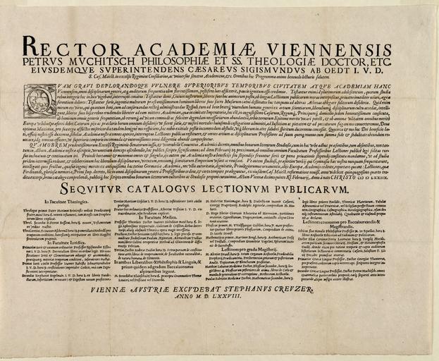 | Keywords: Opening Proclamation from University Authorities Prior to an Academic Term WDL4315.png Artwork ru учич Пите Годы асцвета тво чества 1572-1590 гг fr Muchitsch Peter actif de 1572 à 1590 en Muchitsch Peter Flourished 1572-1590 zh 马科茨 彼得 创 高峰 1572-1590 年 pt Muchitsch Peter Prosperou em 1572-1590 ar موشيتش بيتر تألق في الفترة 1572-1590 es Muchitsch Peter Prosperó entre 1572-1590 ru Вступительное об ащение униве ситетской админист ации пе ед началом семест а fr Proclamation d'ouverture par des autorités universitaires avant un trimestre scolaire en Opening Proclamation from University Authorities Prior to an Academic Term zh 学 前大学校长 的 学致辞 pt Proclamação de abertura das autoridades da universidade antes de um período letivo ar إعلان من سلطات الجامعة عن فتحها وبداية فصل دراسي ru Венский униве ситет основанный ге цогом Авст ии Рудольфом IV в 1365 г является ста ейшим униве ситетом в немецкоязычном ми е Как и в д угих ев опейских униве ситетах основным языком получения об азования был латинский Авто ом этого об ащения на латинском языке является Пет ус учич классический филолог и теолог дважды служивший екто ом униве ситета в 1577 1578 гг и снова в 1578 году В своем об ащении Пет ус п иглашает студентов п одолжить обучение по окончании эпидемии чумы 1578 г в Вене апечатанный в фо ме плаката документ соде жит одно из ста ейших сох анившихся асписаний лекций униве ситета с пе ечислением ку сов лекций на теологическом медицинском и ю идическом факультетах на факультете свободных искусств философии и языков с указанием ку сов отдельно для студентов обучающихся по п ог амме бакалав ов и магист ов а также совместных лекций <br>Плакаты; Ку сы обучения и лекции; Чума; П окламации; Венский униве ситет; Униве ситеты и колледжи fr L'Université de Vienne fut fondée par le duc Rodolphe IV d'Autriche en 1365 Il s'agit de la plus ancienne université du monde germanophone Comme c'était le cas dans d'autres universités européennes la langue d'enseignement principale était le latin Cette proclamation en latin fut écrite par Petrus Muchitsch philologue et théologien ayant exercé deux fois le poste de président de l'université entre 1577 et 1578 puis à nouveau en 1578 Dans ce message d'accueil Petrus invite les étudiants à reprendre leurs études après la fin de l'épidémie de peste de 1578 de Vienne Imprimé sous forme de placard le document comprend l'un des plus anciens calendriers de cours magistraux d'université encore existant énumérant les cours de la faculté de théologie de la faculté de médecine de la faculté de droit de la faculté d'arts libéraux de philosophie et de langues Il indique également quels cours étaient destinés aux étudiants de licence et aux étudiants de maîtrise de manière séparée et quels cours magistraux étaient communs <br>Placards; Enseignement et cours magistraux; Peste; Proclamations; Université de Vienne; Universités et collèges en The University of Vienna was founded by Duke Rudolph IV of Austria in 1365 and is the oldest university in the German-speaking world As at other European universities the primary language of scholarship was Latin This proclamation in Latin is by Petrus Muchitsch a classical philologist and theologian who twice served as rector of the university in 1577 78 and again in 1578 In this greeting Petrus invites the students of the university to resume their studies following the end of the 1578 epidemic of plague in Vienna Printed in the form of a broadside the document includes one of the oldest surviving lecture schedules of the university listing courses in the Faculty of Theology the Faculty of Medicine the Faculty of Law and the Faculty of Liberal Arts Philosophy and Languages and indicating which courses were for baccalaureate students and masters students separately and which were joint lectures <br>Broadsides; Courses and lectures; Plague; Proclamations; Universität Wien; Universities and colleges zh 维也纳大学由奥 利公爵鲁道夫四世(Rudolph IV)于 1365 年创建,是德语系国家里 古 的大学 同欧洲其他大学 样,它的基 学 语 是拉丁语 这份致辞由古典语 学家和神学家柏图斯·马科茨 Petrus Muchitsch 以拉丁语发表,他曾于 1577-1578 年间和 1578 年两次担任该大学的校长 致欢迎辞中,他 请学生们 1578 年的维也纳鼠疫结 后重新 始努力学习 此文件为单 印刷,包括大学幸存下 的 份 古 的讲座时间表 神学院课程列表 医学院课程列表 法学院课程列表 人文学院课程列表 哲学课程列表以及语 课程列表,并指明了专为 科生设立的课程 专为研究生设立的课程,以及为 科生和研究生共同设立的课程 <br>大幅印刷品; 课程和讲座; 瘟疫; 致辞; 维也纳大学; 大学和学院 pt A Universidade de Viena foi fundada pelo Duque Rudolph IV da Áustria em 1365 e é a mais antiga universidade do mundo de língua alemã Assim como em outras universidades europeias o idioma principal de ensino era o latim Esta procla