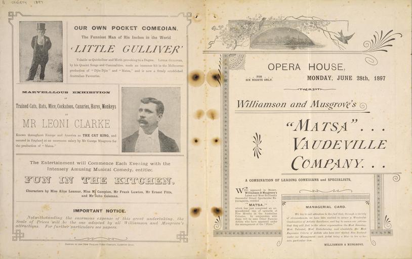 Keywords: document text writing sketch drawing indoor Decorative border on front cover; the back cover shows portraits and biographical notes about two of the performers of the company ("Little Gulliver", comedian and Mr Leoni Clarke who exhibited trained rats, cats, mice, cockatoos, canaries, hares and monkeys). Quantity: 1 colour photo-mechanical print(s) (on programme). Physical Description: Engravings and letterpress on sheet 267 x 420 mm. Opera House (Wellington) :Williamson and Musgrove's "Matsa" Vaudeville Company ... a combination of leading comedians and specialists. [Back and front covers of information brochure]. Monday, June 28th, 1897.. [Theatre programmes for variety, comedy, and music-hall shows and performances toured throughout New Zealand. 1890s].. Ref: Eph-B-VARIETY-1897-01-1. Alexander Turnbull Library, Wellington, New Zealand. natlib.govt.nz/records/22685244 Decorative border on front cover; the back cover shows portraits and biographical notes about two of the performers of the company ("Little Gulliver", comedian and Mr Leoni Clarke who exhibited trained rats, cats, mice, cockatoos, canaries, hares and monkeys). Quantity: 1 colour photo-mechanical print(s) (on programme). Physical Description: Engravings and letterpress on sheet 267 x 420 mm. Opera House (Wellington) :Williamson and Musgrove's "Matsa" Vaudeville Company ... a combination of leading comedians and specialists. [Back and front covers of information brochure]. Monday, June 28th, 1897.. [Theatre programmes for variety, comedy, and music-hall shows and performances toured throughout New Zealand. 1890s].. Ref: Eph-B-VARIETY-1897-01-1. Alexander Turnbull Library, Wellington, New Zealand. natlib.govt.nz/records/22685244 |