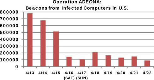 | Keywords: Operation ADEONA coreflood.svg en A graph illustrating the number of Coreflood Beacons per Day following Operation ADEONA Please note While the beacons per day BPD metric is a reasonable measure of the size of the Coreflood Botnet it is not the same as the number of infected computers because an infected computer may be re-started several times per day increasing the BPD or not re-started or turned on at all decreasing the BPD The actual number of infected computers in the Coreflood Botnet is not known notwithstanding the Government ™s control of the substitute servers because the Government is not receiving content from the infected computers including content that would enable the Government to uniquely identify each infected computer http //www justice gov/opa/documents/coreflood-govt-supp pdf FBI 4-23-2011 PD-USGov Botnet Uncategorized 2015 February 4 |