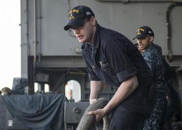 | Keywords: Operation Inherent Resolve 150225-N-KB426-028.jpg en 150226-N-KB426-028 ABU DHABI United Arab Emirates Boatswain ™s Mate Seaman Kenneth Wake heaves a mooring line on the fantail of the aircraft carrier USS Carl Vinson as the ship makes final preparations to depart Abu Dhabi Vinson is deployed as part of the Carl Vinson Strike Group supporting maritime security operations strike operations in Iraq and Syria as directed and theater security cooperation efforts in the U S 5th Fleet area of responsibility 2015-02-25 Feb 21 2015 https //www dvidshub net/image/1794727 150225-N-KB426-028 2015-03-03 05 44 ABU DHABI AE PD-USGov-Military-Navy USS Carl Vinson CVN-70 Images from DoD uploaded by Fæ |