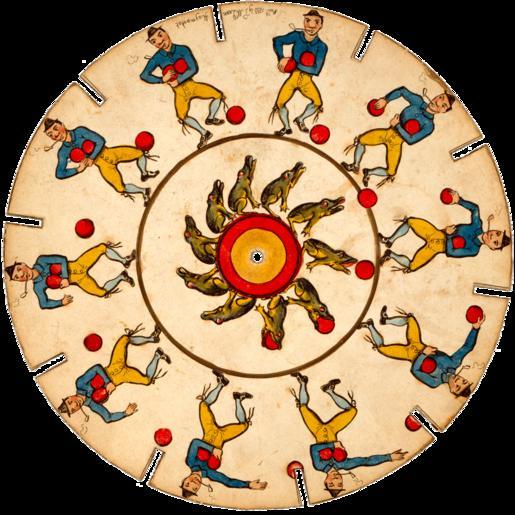 Keywords: Optical illusion disc with man and frog.gif Optical illusion disc which is spun displaying the illusion of motion of a ball passing between a frog in a circle at the center of the disc and a man in a circle at the outer edge of the disc Part of McLean ™s Optical Illusions or Magic Panorama a boxed set of 12 discs Hand-colored lithograph LOC-image cph 3g08091 pnp 1833 author Published by Thomas McLean PD-retouched-user Racconish 1833 in England Phenakistoscope PD-old-100 |