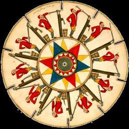 | Keywords: Optical illusion disc with man pumping water.gif Optical illusion disc which is spun displaying the illusion of motion of a man pumping water in a circle at the outer edge of the disc Part of McLean ™s Optical Illusions or Magic Panorama a boxed set of 12 discs Hand-colored lithograph LOC-image cph 3g08093 pnp 1833 author Published by Thomas McLean PD-retouched-user Racconish 1833 in England Phenakistoscope PD-old-100 | ||||