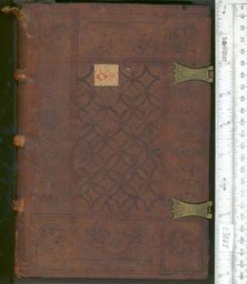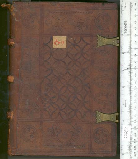 | Keywords: Opus regale in quo continentur infrascripta opuscula - Upper cover (c30k5).jpg Style Panel design; Caption Upper cover; Colour Brown; Edge Unspecified exhibition history Decorative Technique Tooled in blind; Cover Material Calf Wooden boards With 2 pairs of clasps Ms title written on tail Ms vellum label on upper cover Rebacked Macchi suggested this was a German binding first half century due to the the fleur the lis tool I Schunke Die Schwenke-Sammlung Lilie p 184 n 454 a and the fastenings on the upper cover object history Text 1508; Lyons; Unspecified object type Cc-zero place of creation Binding France place of discovery Unspecified British Library image http //www bl uk/catalogues/bookbindings/LargeImage aspx RecordId 020-000004912 ImageId ImageId 42061 Copyright BL Opus regale in quo continentur infrascripta opuscula Uploaded with GWToolset Opus regale in quo continentur infrascripta opuscula - Upper cover c30k5 http //www webarchive org uk/bldatasets/bindings/6637_4 jpg Bookbinding 16th-century bookbinding British Library Bookbindings |
