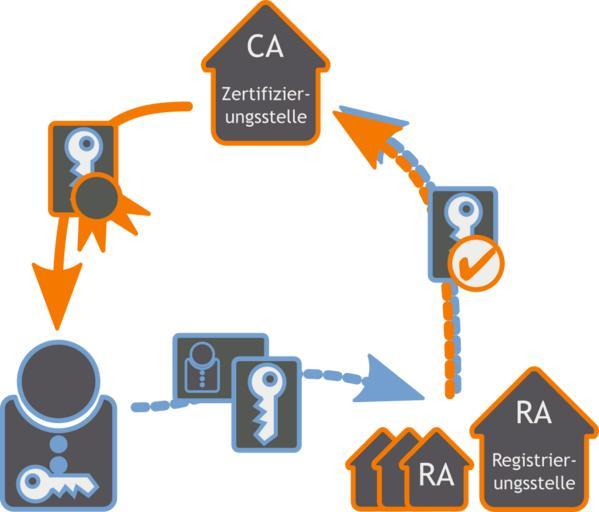 | Keywords: Orange blue public key infrastructure 3 de.svg en Principle of a public key infrastructure A user applies for a certificate with his public key at a registration authority RA The latter confirms the user's identity to the certification authority CA which in turn issues the certificate de Prinzip einer Public-Key-Infrastructure Teilnehmer authentifiziert sich gegenüber Registrierungsstelle diese bestätigt den öffentlichen Schlüssel des Teilnehmers gegenüber der Zertifizierungsstelle Die Zertifizierungsstelle stellt dem Teilnehmer ein Zertifikat aus 2012-06-15 own Bananenfalter <gallery> File Public-Key-Infrastructure svg Original version File Orange blue public key infrastructure 3 de text svg Translateable version </gallery> Similar Images <gallery> File Orange blue public key infrastructure 1 de svg PKI without text File Orange blue public key infrastructure 2 de svg PKI with text File Orange blue public key infrastructure 4 de svg PKI detail verification </gallery> cc-zero Uploaded with UploadWizard Orange blue cryptography diagrams |