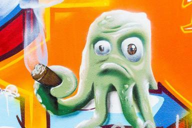 Keywords: orange cigar nature monster green color graffiti pest street scene street art urban art squid painting bad mood wall facade