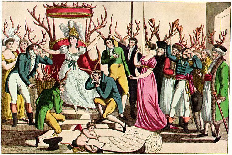 | Keywords: Order-cuckoldry-ca1815-French-satire.jpg La fête de l'Ordre des Cocus devant le trône de Sa Majesté Infidélité The celebration fête of the Order of Cuckoldry before the throne of her majesty Infidelity A satirical colored French print ca 1815 that parodies knightly orders such as the English order of the Garter etc etc which traditionally held annual feasts on the day of the patron-Saint of the order This caricature makes full use of the traditional European folkloric metaphor that the husband of a sexually unfaithful wife has horns on his head In fact all the individuals shown except Infidelity herself her servant cupid and the fifth person from the right are wearing horns -- and there's a basket of extra horns to the left of the throne and the canopy above the throne is decorated with smaller horns Note the gentlemen from non-Western-European nations at the right of the picture and also the lady in the pink dress who is firmly calling her husband's attention to the horns on her own head Most of the members of the Order look none too pleased with the honor The huge scroll at bottom is a membership list; the cupid is writing on the scroll Liste de Msrs les Membres Composant la gde famille de Vénérables Cocus Cornards Cornettes et Cornillons de tous les Pais c modern French spelling is pays An approximate English translation would be List of members composing the grand family of honorable cuckolds of all nations etc with a list of synonyms and pseudo-synonyms for cuckold in the original French Caricatures of France Marriage in art Human sexuality in art 1810s fashion Adultery Non-monogamy PD-old-100 |
