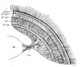Keywords: Origin of Vertebrates Fig 038.png Fig 38 ”The Retina of Musca After Berger Br brain; O n optic nerve; n l o g nuclear layer of ganglion of optic nerve; m l molecular layer Punktsubstanz ; n l r g i and n l r g o inner and outer nuclear layers of the ganglion of the retina; f br r terminal fibre-layer of retina; r layer of retinal end-cells indicated only 1908 The Origin of Vertebrates https //archive org/details/originofvertebra1908gask Walter Holbrook Gaskell PD-old-auto-1923 1914 Origin of Vertebrates book Musca Insect eyes