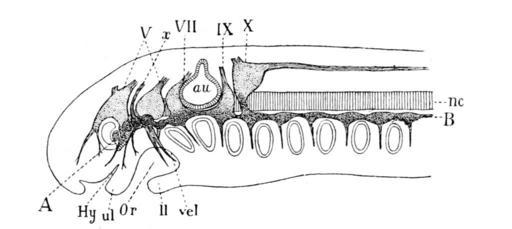 | Keywords: Origin of Vertebrates Fig 100.png Fig 100 ”Ganglia of the Cranial Nerves of an AmmocĹ“tes 4 mm in length projected on to the Median Plane After Kupffer A-B the line of epibranchial ganglia; au auditory capsule; nc notochord; Hy tube of hypophysis; Or oral cavity; u l upper lip; l l lower lip; vel septum between oral and respiratory cavities; V VII IX X cranial nerves; x nerve with four epibranchial ganglia All references in this work to AmmocĹ“tes or Petromyzon appear to refer to the European Brook Lamprey now called Lampetra planeri 1908 The Origin of Vertebrates https //archive org/details/originofvertebra1908gask Walter Holbrook Gaskell PD-old-auto-1923 1914 Origin of Vertebrates book Lampetra planeri |