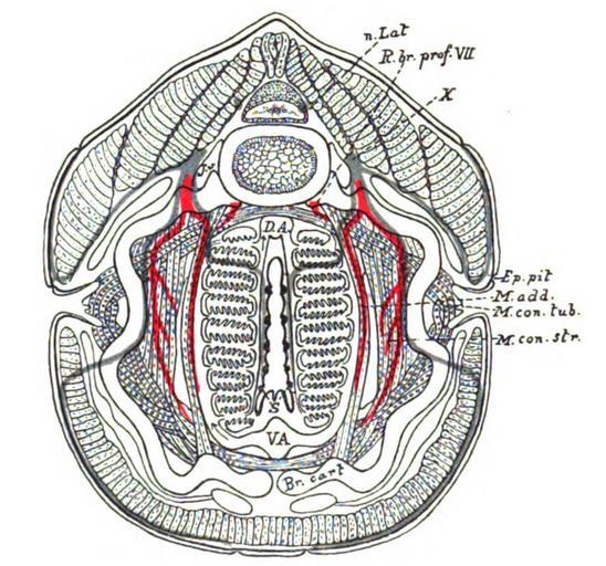 | Keywords: Origin of Vertebrates Fig 124.jpg Fig 124 ”Diagram constructed from a series of Transverse Sections through a Branchial Segment of AmmocĹ“tes showing the arrangement and relative positions of the Cartilage Muscles Nerves and Blood-Vessels Nerves coloured red are the motor nerves to the branchial muscles Nerves coloured blue are the internal sensory nerves to the diaphragms and the external sensory nerves to the sense-organs of the lateral line system Br cart branchial cartilage; M con str striated constrictor muscles; M con tub tubular constrictor muscles; M add adductor muscle; D A dorsal aorta; V A ventral aorta; S sense-organs on diaphragm; n Lat lateral line nerve; X epibranchial ganglia of vagus; R br prof VII ramus branchialis profundus of facial; J v jugular vein; Ep pit epithelial pit All references in this work to AmmocĹ“tes or Petromyzon appear to refer to the species now called Lampetra planeri 1908 The Origin of Vertebrates https //archive org/details/ost-biology-the_origin_of_vertebrates Walter Holbrook Gaskell PD-old-auto-1923 1914 Origin of Vertebrates book Lampetra planeri |