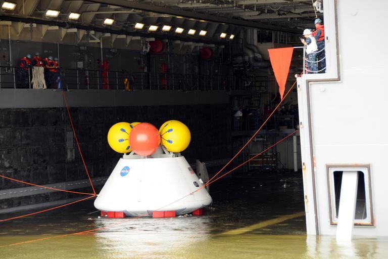 | Keywords: Orion recovery test 130815-N-VJ183-019.jpg en NASA engineers and Navy divers and sailors assigned to the amphibious transport dock ship USS Arlington prepare to tow a 1-1 scale mockup of the Orion spacecraft out of the well deck of Arlington This phase one test was to determine the best method for recovering NASA's newest manned spacecraft after earth re-entry and splash down in the ocean The test was conducted pier side at Naval Station Norfolk Aug 15 Phase 2 will be an open ocean recovery simulation in the Pacific Ocean off the coast of California in 2014 2013-08-15 LPD 24 https //www dvidshub net/image/996287 130815-N-VJ183-019 2013-08-15 16 44 NORFOLK VA US PD-USGov-Military-Navy Naval Station Norfolk USS Arlington LPD-24 Images from DoD uploaded by Fæ |
