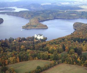 Keywords: Orlík 6.jpg Orlík Chateau on Orlík dam on Vltava river the Czech Republic zámku Orlík na břehu Orlické přehrady na řece Vltavě střední Čechy own Karelj 2009-10 49 30 30 05 N 14 10 1 54 E Orlík Reservoir Aerial photographs of Orlík