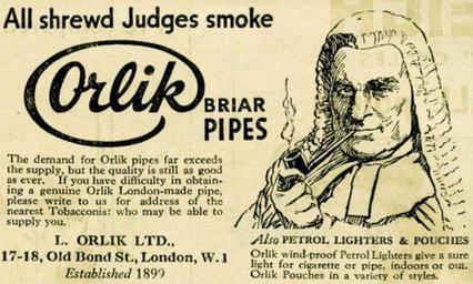 | Keywords: Orlik pipes advertisement.jpg Advertisement for the Orlik pipe company showing their trademark judge figure http //pipesmagazine com/forums/topic/a-few-cool-vintage-ads Pipemagazine com 1920 Orlik Company Advertisements in the United Kingdom Smokers pipes in art Judges in art 1920 advertisements Unclear-PD-US-old-70 |