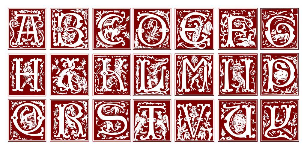 | Keywords: Ornamental Alphabet - 16th Century edit.svg en Ornamental latin alphabet from the 16th century missing the letters J O W X and Z Vectorized with Inkscape from the original scan at http //www fromoldbooks org/DelamotteOrnamentalAlphabets/pages/051-16th-Century/ then cleaned up for optimal appearance Delamotte F Ornamental Alphabets Ancient and MediƦval 1879 - provided by http //www fromoldbooks org/DelamotteOrnamentalAlphabets/pages/051-16th-Century/ From Old Books Delamotte F vectorized by JovanCormac edited by ZooFari century 16 PD-old Alphabets |