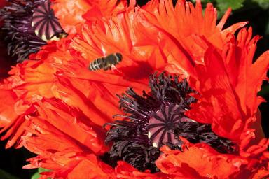 Keywords: ornamental poppies half rosette plant flower nature flora spring blossom bloom ornamental plant red green bee flying