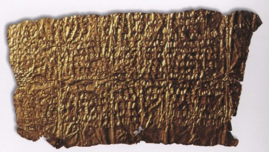| Keywords: Orphic Gold Tablet (Hipponion-Museo Archeologico Statale Capialbi, Vibo Valentia).jpg 25px For the original greek text and it translation in english and italian see -----> discussion page Per il testo originale in greco e per la sua traduzione in italiano e inglese vedi -----> pagina di discussione it Laminetta orfica oro 5 9 x 4 9 x 3 2 cm Museo Archeologico Statale di Vibo Valentia Dalla necropoli di Hipponion attuale Vibo Valentia in Calabria IV secolo a C Il testo di 16 righe scritto in greco dice <br> A Mnemosyne appartiene questo sepolcro Appena che sarai venuto a morte / andrai alle case ben costruite di Ade vi è sulla destra una fonte / accanto ad essa si erge un bianco cipresso; / lì discendono le anime dei morti e cercano refrigerio / A questa fonte non accostarti neppure; / ma più avanti troverai la fresca acqua che scorre / dal lago di Mnemosyne vi saranno innanzi custodi / ed essi ti chiederanno in sicuro discernimento / che mai cerchi attraverso le tenebre di Ade funesto / Dici Son figlio della Greve e del Cielo stellato; / di sete sono riarso e mi sento morire; ma datemi presto / la fresca acqua che scorre dal lago di Mnemosyne / Ed allora ti saranno misericordiosi per volere del sovrano di sotterra / e ti daranno da bere l'acqua del lago di Mnemosyne / Ed allora andrai lontano per la sacra via sulla quale anche gli altri / mystai e bacchoi si allontanano gloriosi Traduzione di Giovanni Pugliese Carratelli in Studi sulla Calabria Antica in La Parola del Passato fasc CLIV-CLV vol XXIX Napoli 1974 pag 111 en Orphic gold leaflet from the Necropolis of Hipponion now Vibo Valentia en Calabria Ca 400 BCE 9 x 4 9 x 3 2 cm Museo Archeologico Statale di Vibo Valentia Text This is the work of Mnemosyne Memory When you are about to die you will find the houses of Hades There is a spring on the right side beside it a white cypress tree stands There the souls of the dead come and rest Do not go near these streams Further you will find the cold water from the harbor of Memory Orphisches Goldblättchen aus der Nekropole von Hipponion heute Vibo Valentia Kalabrien Ca 400 v Chr Goldblech 5 9 x 4 9 x 3 2 cm Museo Archeologico Statale di Vibo Valentia Siehe M L West Zum neuen Goldblättchen aus Hipponion In Zeitschrift für Papyrologie und Epigraphik Bd 18 1975 S 229-236 http //www sbvibonese vv it/sezionec/pag249_c aspx sconosciuti IV secolo a C PD-old Orphic Gold Tablets Hipponion Ancient Greek inscriptions in Italy Archaeological gold objects Museo archeologico statale Vibo Valentia Ancient Greek graffiti |