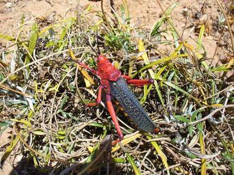 Keywords: ORTHOPTERA Pyromorphidae; Phymateus morbillosus.jpg en Common Milkweed locust Own Andrew massyn Dec 06 Worcester Botanic Gardens Western Cape Phymateus morbillosus