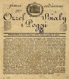 | Keywords: Orzel Bialy i Pogon.jpg en Polish newspaper White eagle and Pogon 1831 nr 1 pl Orzeł Biały i Pogoń Pismo codzienne 1831 nr 1 http //www pbi edu pl/book_reader php p 17369 s 1 Orzeł Biały i Pogoń 1831 PD-old-100 1831 newspapers November Uprising |