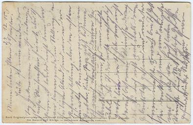 | Keywords: Oscar Tellgmann PC Generalfeldmarschall Graf von Haeseler back side.jpg Generalfeldmarschall Graf von Haeseler Generalfeldmarschall Graf von Haeseler Generalfeldmarschall Graf von Haeseler Text 24 12 15 Meine lieben Eltern Schwester Heute ist nun wieder der Tag gekommen wo ihr lieben Zuhause Weihnachten feiert aber ich kann es leider nicht tun denn wir liegen gerade in Stellung Den Heiligen Abend sind wir in der Reservestellung Aber den ersten Feiertag kommen wir vor im Graben Lieber Papa jetzt besinne ich mich eben auf deinen Geburtstag Nimm es mir nicht übel das ich dir erst nachträglich gratuliere den ich habe mich nicht darauf besonnen Wünsche dir das du noch recht vielmals deinen Geburtstag gesund und munter feiern machst Somit bin ich Gott sei dank gesund und munter was ich auch von euch lieben hoffe Wünsche euch allen gesunde glückliche Weihnachten Mit herzliche Grüße euer Erwin own scan of the original of the postcard in front of me Creator Oscar Tellgmann 1919/ before 1919 PD-old <gallery>File Oscar Tellgmann PC Generalfeldmarschall Graf von Haeseler jpg</gallery> Oscar Tellgmann Gottlieb Graf von Haeseler |