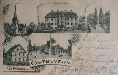 Keywords: Ostbevern Postkarte.JPG Darstellung von Ostbevern alte Postkarte gelaufen 1906 wahrscheinlich um die Jahrhundertwende Schloss Loburg noch als Schlaunbau 1899 abgebrannt Overberg PD History of Ostbevern PD-old