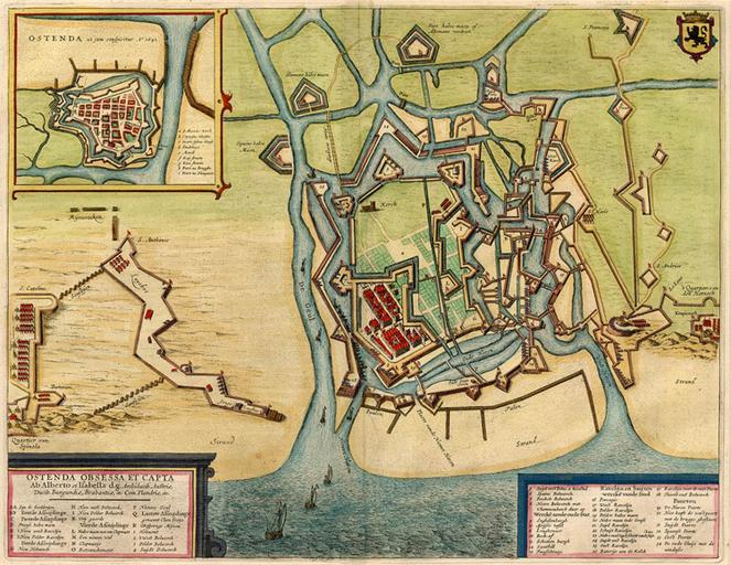 | Keywords: Ostenda obsessa et capta.jpg Ostenda obsessa et capta Mapa de la ciudad de Ostende durante el sitio de 1601 - 1604; el norte en la parte inferior Obra de Joan Blaeu hacia 1649 grabado de 37 x 49 cm Abajo el Mar del Norte En el centro en rojo los edificios de la ciudad vieja junto al puerto separada de la parte nueva en verde por un canal El canal que aparece a la izquierda de la ciudad es el Geule por donde los barcos circulaban hacia el puerto El canal de la derecha es el Old Haven Entre éste y la ciudad un sistema de esclusas marrón controlaban el flujo de agua hacia los fosos Alrededor de la ciudad en la parte exterior del canal que la rodea las construcciones poligonales con el vértice hacia el exterior son los baluartes holandeses En la parte izquierda de la imagen aparece el cuartel de los tercios bajo el mando del conde de Bucquoy; la construcción en línea quebrada es el dique levantado por éstos para servir de soporte a la artillería que intentaba impedir el tráfico de barcos hacia la ciudad El terreno sobre el que se asentaba era inundado en la pleamar Al oeste derecha con los vértices hacia la ciudad las líneas del archiduque Alberto de Austria En el cuadrante superior izquierdo vista de la ciudad con el norte arriba Mapa del sitio de Ostende de 1601 - 1604 http //www sanderusmaps com/antique-maps/europe/oostende_4340 cfm 1649 creator Joan Blaeu PD-old-100 Maps by Willem and Johannes Blaeu 1649 Old maps of Ostend Military history of Spain Siege of Ostend |