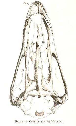 | Keywords: OstrichSkull.jpg Skull of Ostrich captions Pmx premaxilla ; Mxp maxillo-palatine ; Va vomer ; Pl palatine ; Pt pterygoid R rostrum � The Structure and Classification of Birds 1898 Frank E Beddard 1898 Frank E Beddard pd-old PD-old Ostriches in art Struthio camelus skulls |