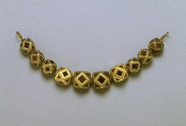 | Keywords: Ostrogothic - Polyhedral Beads - Walters 571746 - View A.jpg These ten beads were probably part of a woman's necklace They are made of thin sheet gold that was cut and folded around a core of pitch pine resin Slices of garnet backed with foil to enhance their brilliance were inserted into the pitch between the gold frames This technique of combining gold and foil-backed garnets is characteristic of the Goths of South Russia century 5 Early Medieval gold with garnets over pitch cm 3 4 9 1 3 accession number 57 1746 21359 Joseph Chmielowski Ochakov Ukraine Joseph Chmielowski Sale Amercian Art Gallery New York February 23-25 1922 lot 710 Henry Walters New York date of acquisition unknown by purchase Sadie Jones Mrs Henry Walters New York 1931 by inheritance Mrs Henry Walters Sale New York December 1-4 1943 lot 537 The Hammer Galleries New York date and mode of acquisition unknown Walters Art Museum September 19 1945 by purchase Museum purchase with funds provided by the S A P Fund 1945 Early Christian and Byzantine Art Baltimore Museum of Art Baltimore 1947 Romans and Barbarians Museum of Fine Arts Boston Boston 1976-1977 Jewelry - Ancient to Modern The Walters Art Gallery Baltimore 1979-1980 Objects of Adornment Five Thousand Years of Jewelry from the Walters Art Gallery Baltimore Cooper-Hewitt National Design Museum New York; Chrysler Museum of Art Norfolk; Carnegie Museum of Art Pittsburgh; San Antonio Museum of Art San Antonio; Philbrook Museum of Art Tulsa; Honolulu Academy of Arts Honolulu; New Orleans Museum of Art New Orleans; Milwaukee Art Museum Milwaukee; Minneapolis Institute of Arts Minneapolis; Toledo Museum of Art Toledo; The John and Mable Ringling Museum of Art Sarasota 1984-1987 Jewelry from the Walters Art Museum and the Zucker Family Collection The Walters Art Gallery Baltimore 1987 place of origin Russia Walters Art Museum license Medieval metalwork in the Walters Art Museum Jewellery in the Walters Art Museum Media contributed by the Walters Art Museum needs category review Ostrogothic jewellery |