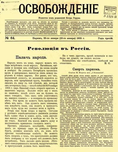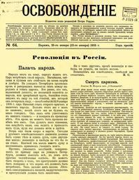 Keywords: Osvobozhdeniye Yanvar 1905.jpg ru Пе вая ст аница жу нала Освобождение от 25 янва я 1905 года возвестившего о начале усской еволюции Жу нал Освобождение 64 от 25 12 янва я 1905 года ет 25 12 янва я 1905 года Bloody Sunday 1905 PD-old