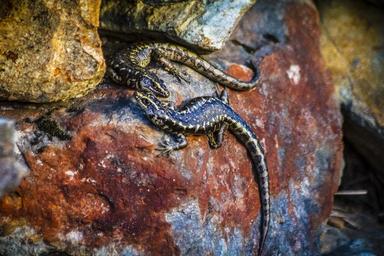 | Keywords: texture outdoor Grand and Otago skinks are two of New Zealand's most distinctive and impressive lizards. Known as giant skinks, they are our largest lizards, with Otago skinks growing up to 300 mm in length and grand skinks 230 mm. Unlike many lizards overseas, both species are omnivorous, diurnal, and don't hibernate. They can live for up to 20 years in the wild, and like all lizards in this country, give birth to live young - two or three a year. Both species are distinctively marked, which is why southern Māori know them as mokomoko. Grand skinks are black with yellowish flecks, and Otago skinks, black with grey, green, or yellowish blotches. These cryptic colour patterns provide great camouflage, amid the lichen-covered schist rocks they inhabit. www.doc.govt.nz/nature/native-animals/reptiles-and-frogs/... en.wikipedia.org/wiki/Skink Grand and Otago skinks are two of New Zealand's most distinctive and impressive lizards. Known as giant skinks, they are our largest lizards, with Otago skinks growing up to 300 mm in length and grand skinks 230 mm. Unlike many lizards overseas, both species are omnivorous, diurnal, and don't hibernate. They can live for up to 20 years in the wild, and like all lizards in this country, give birth to live young - two or three a year. Both species are distinctively marked, which is why southern Māori know them as mokomoko. Grand skinks are black with yellowish flecks, and Otago skinks, black with grey, green, or yellowish blotches. These cryptic colour patterns provide great camouflage, amid the lichen-covered schist rocks they inhabit. www.doc.govt.nz/nature/native-animals/reptiles-and-frogs/... en.wikipedia.org/wiki/Skink |