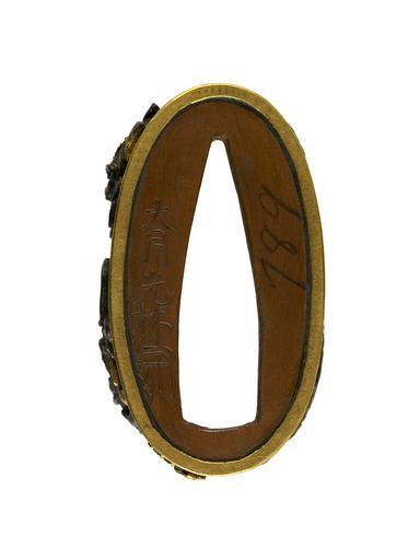 Keywords: Ôtsuki Mitsushige - Fuchi with Benkei and Yoshitsune Fighting - Walters 511052 - Mark A.jpg This is scene is the legendary fight between Benkei and Yoshitsune also known as Ushiwakamaru on the Gojô bridge in Kyoto Benkei had unusual strength but Yoshitsune had been trained in fighting by mythical mountain demons called tengu Benkei was amazed at Yoshitsune's great skill and became his follower This is part of a set with Walters 51 1053 late 17th-early 18th century Edo shakudo gold copper cm 3 7 l accession number 51 1052 8220 William T / Henry Walters Collection Baltimore date and mode of acquisition unknown Walters Art Museum Henry Walters Acquired by William T or Henry Walters Signature Ôtsuki Korin; Number In pencil 789 place of origin Kyoto Japan Walters Art Museum license Media contributed by the Walters Art Museum needs category review Fuchi showing Yoshitsune and Benkei's duel on the Gojo-bashi by Ôtsuki Mitsushige 789 number |