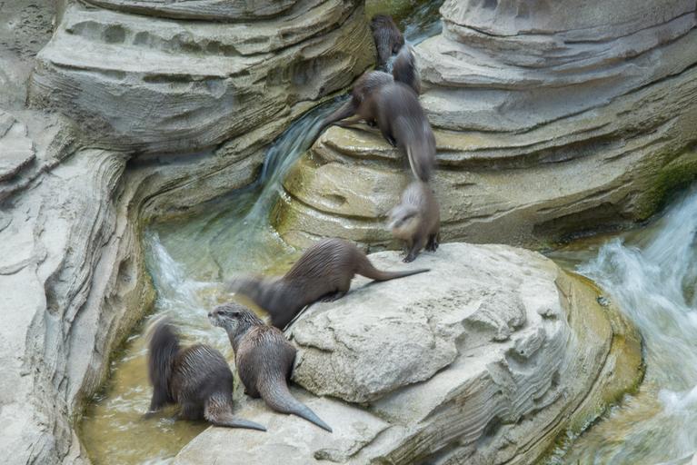 Keywords: otter dwarf motion zoo fur mammal nature wildlife animal cute boulder family rock captivity group hunter hunting queue line