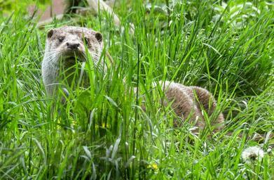 Keywords: otter water hunt grass rest clean fur