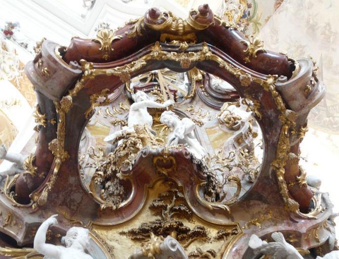 Keywords: Ottobeuren kloster Ottobeuren font 005.JPG Looking up toward the decorations above the baptismal font at Ottobeuren Abbey Ottobeuren Germany Own Mattana 2009-04-08 Images by Mattana-Ottobeuren Germany Baptismal font in Basilika Ottobeuren