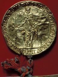 | Keywords: OttoIVgb.jpg de Goldbulle Kaiser Ottos IV an Urkunde für Markgraf Hildebrand von Tuszien ASV AA Arm I-XVIII 10 Urkunde Ottos IV für Markgraf Hildebrand von Tuszien author 1210 aus Die Goldsiegelsammlung aus dem Geheimarchiv des Vatikans München o J 1990 ; hier Bamberger Fassung von 1991 Nr 6 Otto IV Holy Roman Emperor 13th-century seals Golden Bulls PD-old-100 |