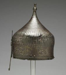 | Keywords: Ottoman or Persian - Turban Helmet with Eye Holes - Walters 5170 - Left.jpg A warrior would have worn this helmet over a cloth turban He would have been confident of being safeguarded in battle by the writing around the helmet's rim The inscription from the Qur'an is garbled however indicating that its Iranian maker may not have known Arabic Yet the presence of Arabic writing apparently was thought to be enough to invoke the protective power of God's word This helmet once belonged to the royal arsenal in Istanbul Turkey It was probably part of the war booty amassed by the Ottoman Dynasty during the many wars between Turkey and Iran Later it was owned by the French painter Jean-Léon Gérôme who traveled throughout the Near East and painted many scenes of Muslim life ca 1450 1500 late Medieval steel with silver inlay cm 38 5 23 4 h x diam accession number 51 70 6002 Armory of Constantinople Jean-Léon Gérome Collection Dikran Kelekian New York and Paris Henry Walters city Baltimore Walters Art Museum Henry Walters Acquired by Henry Walters 1913 place of origin east Turkey Ottoman or northwest Iran Persia Walters Art Museum license Islamic metalwork in the Walters Art Museum Indo-Persian armour in the Walters Art Museum Media contributed by the Walters Art Museum needs artist review 15th-century helmets Turban helmets |