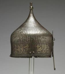 | Keywords: Ottoman or Persian - Turban Helmet with Eye Holes - Walters 5170 - Right.jpg A warrior would have worn this helmet over a cloth turban He would have been confident of being safeguarded in battle by the writing around the helmet's rim The inscription from the Qur'an is garbled however indicating that its Iranian maker may not have known Arabic Yet the presence of Arabic writing apparently was thought to be enough to invoke the protective power of God's word This helmet once belonged to the royal arsenal in Istanbul Turkey It was probably part of the war booty amassed by the Ottoman Dynasty during the many wars between Turkey and Iran Later it was owned by the French painter Jean-Léon Gérôme who traveled throughout the Near East and painted many scenes of Muslim life ca 1450 1500 late Medieval steel with silver inlay cm 38 5 23 4 h x diam accession number 51 70 6002 Armory of Constantinople Jean-Léon Gérome Collection Dikran Kelekian New York and Paris Henry Walters city Baltimore Walters Art Museum Henry Walters Acquired by Henry Walters 1913 place of origin east Turkey Ottoman or northwest Iran Persia Walters Art Museum license Islamic metalwork in the Walters Art Museum Indo-Persian armour in the Walters Art Museum Media contributed by the Walters Art Museum needs artist review 15th-century helmets Turban helmets |