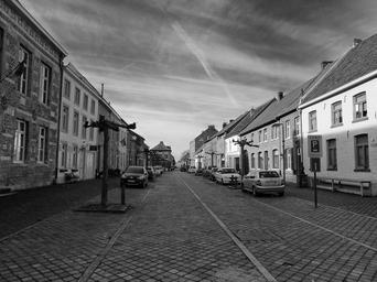 Keywords: oud-rekem belgium houses homes buildings cars autos street town city skyline architecture black and white sky clouds outside