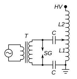 | Keywords: Oudin coil circuit - later type.svg Oudin coil a resonant transformer circuit very similar to a Tesla coil that produces high voltage low current radio frequency alternating current used the in early 20th century medical treatment electrotherapy It was invented around 1893 by French physician Paul Marie Oudin as a development of Jacques Arsene d'Arsonval's electrotherapy equipment A handheld electrode would be attached by a wire to the high voltage terminal of the device and the streamer arcs it produced would be applied to the patient's body to treat various medical conditions <br><br> This was the later version of the circuit in which the primary and secondary coils are wound on the same coil form as an autotransformer to produce higher voltages In the first version Oudin invented shown in Oudin coil circuit - early type svg the secondary resonator coil L2 was not inductively coupled to the primary L1 and generated the high voltage solely by resonance 2014-12-23 own Chetvorno other versions cc-zero Uploaded with UploadWizard Oudin coils Tesla coil circuits |