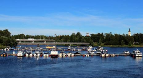 Keywords: oulu finland marina boats ships dock pier bridge trees scenic lake water reflections nature outside summer spring buildings