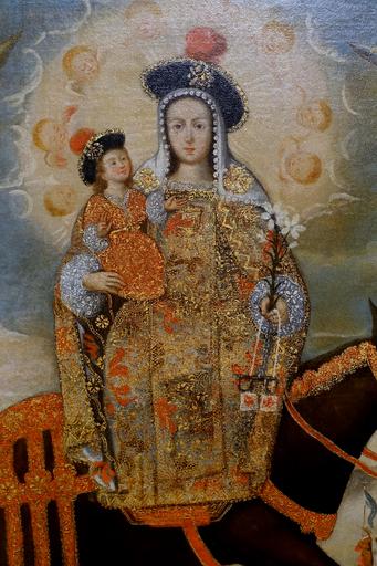 | Keywords: Our Lady of Mercy, called 'The Pilgrim', artist unknown, Cuzco, Peru, 1730s, oil on canvas, detail - Blanton Museum of Art - Austin, Texas - DSC08159.jpg en Exhibit in the Blanton Museum of Art - Austin Texas USA This work is old enough so that it is in the public domain 2015-11-15 16 42 17 own Daderot other versions PD-old-100 cc-zero Cuzco School paintings in the Blanton Museum of Art | ||||