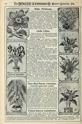 Keywords: Our new guide to rose culture (16384091368).jpg s iBeDINGEE SCONARD p WehtErove Pa <br> Baby Primrose <br> One of the daintiest new plants that <br> I has been introduced in years Ourillus- _ <br> tration shows how freely it bears its long- Wv' <br> stemmed flowers of delicate rose It is <br> valuable from every standpoint The <br> flowers remain fresh for two weeks after <br> cutting It blooms throughout the en- <br> tire year producing succession after <br> succession of flowers It will grow in al- <br> most any situation hot or cold Its flow- <br> ers have become exceedingly popular <br> among the fashionable set in New York <br> and Philadelphia As yet very scarce <br> 25 cts each ; 3 for 50 cts ; 5 for 1 <br> Calla Lilies <br> Ease of culture freedom of bloom and <br> -beauty of flower have made these Lilies <br> almost indispensable They are good at <br> all seasons of the year <br> / LITTLE GEM ”Is indeed a pigmy <br> \f m iii JU ‚¬id f/Oi/a'Ai /pimfi ' \Y ever growing more than twelve <br> _ inches high yet it proauces its snowy- white <br> flowers with the greatest freedom ; it is not <br> ari unusual sisrht to see ten to twelve flowers <br> on a well-established plant Try it 15 cts <br> each ; 2 for 25 cts ; 9 for 1 <br> SPOTTED CALLA ” Leaves dark rich <br> green exquisitely dotted with white marks <br> Ornamental even when not in flower Beau- <br> tiful white flowers with deep black throat <br> 15 cts each ; 2 for 25 cts ; 9 for 1 <br> LILY OP THE NILE ” The old favorite <br> White Calla Too well-known for descripticm <br> Grand white flowers ” chaste and beautiful <br> We offer large bulbs 15 cts each; 2 for <br> 25 cts ; 9 for II <br> THE TRUE BLACK CALLA Arum <br> Sanctum ” Well known as one of the most <br> magnificent and stately plants A native of <br> the Holy Land Flowers sweet-scented very <br> large often measuring a foot in length and <br> five to eight inches wide Inside of flower <br> purplish black outside pleasing green The <br> centre spadix rises from the flowers to a <br> height of ten to twelve inches and is deep <br> black We imported our stock direct from <br> Palestine Sure to grow and bloom First <br> size 15 cts each ; 2 for 25 cts ; 9 for II ; sec- <br> ond size large bulbs 20 cts each ; 3 for 50 cts <br> One each of the 4 Calla Lilies for 50 cts <br> Slac/C il ay <br> Ca/la <br> k <br> New Red Hardy Clematis P <br> nADAHE EDOUARD ANDRE <br> This is a magnificent new variety entirely <br> distinct perfectly hardy and the nearest ap- <br> proach to a bright red ever sent out It is a <br> strong vigorous grower being an offspring <br> pf the popular Jackmanii which it resem- <br> bles in vigorous growth freedom of bloom <br> shape and size of flower The flowers are <br> large four to five inches across and in color <br> are a beautiful deep carmine red a novel and <br> most pleasing shade entirely different from <br> all other varieties This novelty has b en <br> exceedingly scarce and it affords us pleasure <br> that we now have a large stock of strong two- <br> year-old plants that are sure to give you sat- <br> isfaction We make the price low 60c each <br> Fancy-leaved Caladiums <br> y i M y <br> Nothing can equal these in brilliancy of <br> foliage ; to say there are over 400 combina- <br> tions of colors is sufficient The splendid <br> large leaves are beautifully spotted margined and variegated with every imaginable color except blue They <br> are best suited for pot cu lture in house conservatory or shaded situation We have one of the finest and <br> largest stocks in the country which includes all the best named kinds 25c each ; 3 for 60c ; 5 for \ 43875665 149643 77861 Page 78 Text http //www biodiversitylibrary org/page/43875665 1891 10 5962/bhl title 77861 Dingee Conard Co ; Henry G Gilbert Nursery and Seed Trade Catalog Collection NameFound CLEMATIS NameConfirmed Clematis ser Alpina W J Yang L Qian Li EOLID 38289 NameFound Ourillus Biodiversity Heritage Library Our new guide to rose culture 1900 Garden Stories Bulbs Plants Catalogs Dingee Conard Co Flowers Nurseries Horticulture Nursery stock Trade catalogs Vegetables U S Department of Agriculture National Agricultural Library bhl page 43875665 dc identifier http //biodiversitylibrary org/page/43875665 bhlGardenStories Baby Primrose Calla Caladiums Clematis BHLinbloom bulbs plants dingee conard co nurseries horticulture u s department of agriculture national agricultural library bhlgardenstories baby primrose bhlinbloom Information field Flickr posted date ISOdate 2015-02-18 CC-BY-2 0 BioDivLibrary https //flickr com/photos/61021753 N02/16384091368 2015-08-24 02 52 14 cc-by-2 0 PD-old-70-1923 Calla Our new guide to rose culture 1891 Photos uploaded from Flickr by Fæ using a script |