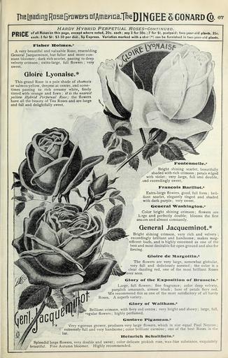 Keywords: Our new guide to rose culture (15951530333).jpg ThEleariin RnsEBrawBKanfAmEi'ina TBeOIf GEE SCONARD 67 <br> HARDY HYBRID PERPETUAL ROSES~CONTINUED <br> ppipp of all Roses on this page except where noted 20c each ; any 3 for 50c ; 7 for 1 postpaid; two-year-old plants 35c <br> r niUki gggj 3 fop ji 3 50 per dbz By Express Varieties marked with a star can be furnished in two-year-old plants <br> Fisber Holmes ' <br> A very beautiful and valuable Rose resembling <br> General Jacqueminot but fuller and more con- <br> stant bloomer ; dark rich scarlet passing to deep <br> velvety crimson ; extra-large full flowers ; very <br> sweet <br> Qloire Lyonaise <br> This grand Rose is a pale shade of chamois <br> or salmon yellow deepest at centre and some- <br> times passing to rich creamy white finely <br> tinted with orange and fawn ; if is the nearest <br> yellow Hybrid Perpetual Rose; the flowers <br> have all the beauty of Tea Roses and are large <br> and full and delightfully sweet <br> Bright shining scarlet beautifully <br> ' shaded with rich crimson ; petals edged <br> ' with violet; very large full and double <br> and exceedingly sweet <br> Extra-large flowers good full form ; bril- <br> liant scarlet elegantly tinged and shaded <br> with dark purple ; very sweet <br> General Washiiigtoii <br> Color bright shining crimson ; flowers are <br> krge and perfectly double; blooms the first <br> sea ; on and almost constantly <br> General Jacqueminot <br> Bright shining crimson very rich and velvety ; <br> X- exceedingly brilliant and handsome ; makes mag- <br> nificent buds and is highly esteemed as one of the <br> best and most desirable for open ground and also for <br> forcing <br> Gloire de Marsrottln <br> The flowers are very large somewhat globular <br> very full and deliciously scented ; the color is a <br> clear dazzling red one of the most brilliant Roses <br> ever seen <br> Glory of the Hxposition of Brussels ' <br> Large full flowers; fine fragrance; color deep velvety <br> purplish amaranth almost black; base of petals fiery red <br> We recommend this as one of the most satisfactory of all hardy <br> Roses A superb variety <br> Glory of W altliam <br> Brilliant crimson with fiery red centre ; very bright and showy; large full <br> -egular flowers ; highly perfumed <br> Gustave Pisraneau <br> Very vigorous grower produces very large flowers which in size equal Paul Neyron ; <br> extremely full and very handsome ; color brilliant carmine ; one of the best Roses in the <br> list <br> Heinricb Schultlieis <br> Splendid large flowers very double and sweet ; color delicate pinkish rose wax-like substance exquisitely <br> beautiful Fine Autumn bloomer Highly recommended 43875654 149643 77861 Page 67 Text http //www biodiversitylibrary org/page/43875654 1891 10 5962/bhl title 77861 Dingee Conard Co ; Henry G Gilbert Nursery and Seed Trade Catalog Collection Biodiversity Heritage Library Our new guide to rose culture 1900 Garden Stories Catalogs Dingee Conard Co Flowers Nurseries Horticulture Nursery stock Roses Seeds Trade catalogs U S Department of Agriculture National Agricultural Library bhl page 43875654 dc identifier http //biodiversitylibrary org/page/43875654 bhlGardenStories Glore Lyonaise General Jacqueminot BHLinbloom dingee conard co nurseries horticulture u s department of agriculture national agricultural library bhlgardenstories glore lyonaise general jacqueminot bhlinbloom Information field Flickr posted date ISOdate 2015-02-18 Check categories 2015 August 24 CC-BY-2 0 BioDivLibrary https //flickr com/photos/61021753 N02/15951530333 2015-08-24 02 54 13 cc-by-2 0 PD-old-70-1923 Our new guide to rose culture 1891 Photos uploaded from Flickr by Fæ using a script |