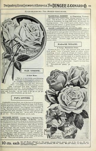 Keywords: Our new guide to rose culture (16385423989).jpg ThELHadiniRnHEErawEFsnfAmEFiDa lBeDIfJGEE gCONARD 53 <br> KVER-BLQQMING TEA ROSES ” CONTINUED <br> This is a very lovely ever-blooming <br> Rose and is always greatly admired by <br> all; It makes elegant buds and the flowers <br> are extra large very full and deliciously <br> sweet; color bright rosy flesh passing to clear <br> rose brightened with pink elegantly shaded <br> and very beautiful It is a strong healthy grower <br> and a wonderfully free and constant bloomer; very hand- <br> some and desirable 10 cts each; 6 for 50 cts ; r per <br> dozen Two-year-old plants 30 cts each <br> PAPA GONTIER <br> A splendid crimson Rose one of the best for all purposes; <br> it makes inr -nense buds and magnificent large bold flowers <br> of great depth and substance ; color rich cherry red passing <br> to clear glowing crimson; very fragrant and beautiful; a <br> strong vigorous grower and constant bloomer; one of the <br> very best and most valuable both for open ground and <br> greenhouse see cut page 52 10 cts each ; 6 for 50 cts ; <br> 1 per doz Two-year-old plants 30 cts each <br> MADAME RIVOY Looks like a Hybrid Per- <br> petual in Flower and Foliage Is Hardy ” In this <br> grand old variety we have a Rose of no ordinary excellence <br> It is entitled to a place among Ever-blooming Roses equal <br> to that which General Jacqueminot takes among Hybrid <br> Perpetuals Indeed it is not unlike a Hybrid Perpetual in <br> the extra-large full and loosely formed crimson-scarlet <br> double flowers enchanting fragrance intensity of color <br> large handsome foliage and extreme vigor <br> it is hardy with slight protection a quick constant <br> profuse blbomer and for butdoor culture canno <br> celled by any Rose of its color 15 cts each ; 4 for 50 cts ; <br> 9 for i Two-year-old plants 30 cts each <br> MARECHAL ROBERT Charming Variety <br> ” We select this variety from among hundreds as extra <br> good The flowers are full double and sweet ; they are <br> borne in abundance on long stiff stems all through the <br> growing season The color is pure white faintly tinged <br> with blush and yellow ; a good healthy grower and alto- <br> gether a pleasing and satisfactory Rose <br> MARIE LAMBERT OR SNOWFLAKE Qne of <br> the best and freest flowering blooming Roses in cultivation <br> equally good for open-ground cultivation and pot culture <br> Outdoors it is especially good being unusually hardy very <br> vigorous and a certain continuous and free bloomer On <br> a siii'gle plant only nine months old 143 buds and flowers <br> were counted Flowers large full and double ; color <br> creamy white <br> MADAME WELCHE <br> A Large Handsome Rose <br> Flowers of great depth ; fine globular form with broad <br> thick petals; color a beautiful shade of amber yellow <br> deepening toward centre to orange or coppery yellow <br> delicately clouded with pale crimson ; flowers and buds are <br> remarkably sweet and the plant is a healthy grower of <br> compact bushy habit producing buds and flowers in <br> abundance during the growing season Fine for open <br> ground as well as for greenhouse Superb in every way <br> 15 cts each ; 4 for 50 cts ; 9 for <br> 1 Two-year-old plants 30 <br> cts each - - / ~ <br> y ot color lyt <br> of growth ; m d <br> instant and n <br> mot be 'ex- L' <br> A f\ T for all Roses offered on tills page except where noted; any 6 for 50 cts ; 1 per <br> III ClS 3 Cn dozen postpaid Two-year-old plants 30 cts each; 8 per dozen by Express at <br> wv »» » vw purchaser's expense 43875640 149643 77861 Page 53 Text http //www biodiversitylibrary org/page/43875640 1891 10 5962/bhl title 77861 Dingee Conard Co ; Henry G Gilbert Nursery and Seed Trade Catalog Collection Biodiversity Heritage Library Our new guide to rose culture 1900 Garden Stories Catalogs Dingee Conard Co Flowers Nurseries Horticulture Nursery stock Roses Seeds Trade catalogs U S Department of Agriculture National Agricultural Library bhl page 43875640 dc identifier http //biodiversitylibrary org/page/43875640 bhlGardenStories Madame Welche Madame Etienne Tea Roses BHLinbloom dingee conard co nurseries horticulture u s department of agriculture national agricultural library bhlgardenstories madame welche madame etienne tea roses bhlinbloom Information field Flickr posted date ISOdate 2015-02-18 Check categories 2015 August 24 CC-BY-2 0 BioDivLibrary https //flickr com/photos/61021753 N02/16385423989 2015-08-24 03 52 16 cc-by-2 0 PD-old-70-1923 Our new guide to rose culture 1891 Photos uploaded from Flickr by Fæ using a script |