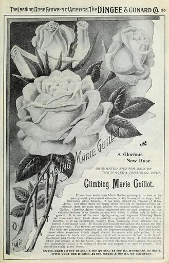 Keywords: Our new guide to rose culture (16384235220).jpg ThEleadin RnsEnrawHKHDfAmBKiGH TBeQIfilGEE SCONARD g 35 <br> A Glorious <br> New Rose <br> ORIGINATED AND FOR SALE BY <br> THE DINGEE CONARD CO ONLY <br> Climbing JWarie Gaillot <br> If you have never seen Marie Guillot growing at its best in the <br> open ground you cannot conceive of the beauty of its large bold <br> handsome white flowers It has been termed the Queen of White <br> Roses and while there are many white varieties of unquestionable ex- <br> cellence there are none more reliable for outdoor cultivation than Marie <br> GuiUot Climbing Marie Guillot originated with us and possesses all the <br> valuable features of its famous parent with which it differs only in habit of <br> growth It is one of the most rapid-growing and vigorous Climbing Roses <br> we have ever seen small plants making a growth of lo to 20 feet in five <br> months It is an exceedingly healthy Rose possessing every attribute that a <br> perfect Rose should have It blooms continuously throughout the season the first <br> and every year The flowers are magnificently made extra large deep and double <br> The buds are particularly beautiful and the fragrance delightful The color is pure <br> snow white sometimes faintly tinged toward the centre with pale yellow It will <br> prove moderately hardv with protection but it will be seen at its best in the South <br> Southwest and Pacific Coast States where the Winters are mild It will bloom the <br> whole year around in the far South; and wherever Marechal Niel is grown this variety <br> will undoubtedly equal it in beauty of flowers and surpass it in vigor of growth It is <br> one of the really grand Roses <br> 15 cts eacb ; 2 for 25 cts ; 5 for 50 cts ; 12 for r postpaid by mail <br> X wo-year-old plants 35 cts eacb; 3 for 1 by Hxpress 43875622 149643 77861 Page 35 Text http //www biodiversitylibrary org/page/43875622 1891 10 5962/bhl title 77861 Dingee Conard Co ; Henry G Gilbert Nursery and Seed Trade Catalog Collection Biodiversity Heritage Library Our new guide to rose culture 1900 Garden Stories Catalogs Dingee Conard Co Flowers Nurseries Horticulture Nursery stock Roses Seeds Trade catalogs U S Department of Agriculture National Agricultural Library bhl page 43875622 dc identifier http //biodiversitylibrary org/page/43875622 bhlGardenStories Climbing Marie Guillot BHLinbloom dingee conard co nurseries horticulture u s department of agriculture national agricultural library bhlgardenstories climbing marie guillot bhlinbloom Information field Flickr posted date ISOdate 2015-02-18 Check categories 2015 August 24 CC-BY-2 0 BioDivLibrary https //flickr com/photos/61021753 N02/16384235220 2015-08-24 03 52 40 cc-by-2 0 PD-old-70-1923 Our new guide to rose culture 1891 Photos uploaded from Flickr by Fæ using a script